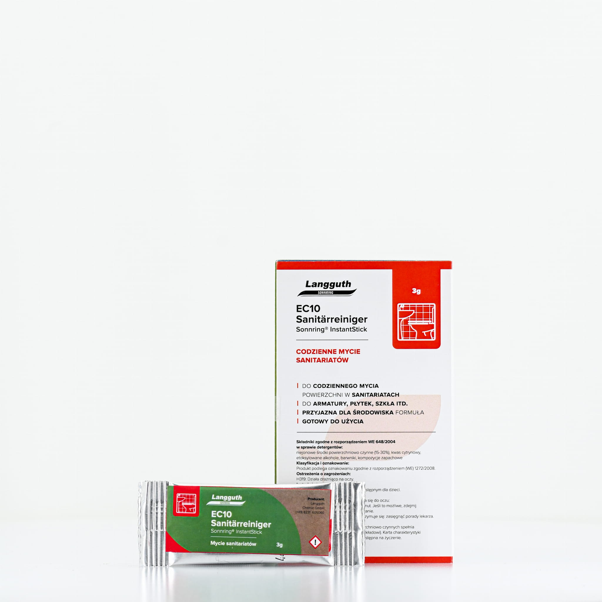 Langguth Sonnring® InstantSticksto unikatowe, ekologiczne i nowoczesne rozwiązanie opracowane dla profesjonalistów! Postanowiliśmy wyjść naprzeciw wyzwaniom stawianym branży sprzątającej i stworzyliśmy linię produktów zapewniających odpowiednie rezultaty czyszczenia bez negatywnego wpływu na środowisko. Dodatkowo nasze formuły zamknęliśmy w małych saszetkach wsypywanych do butelek wielokrotnego użytku. Cały system zapewnia minimalizację zużycia wody przy produkcji środków,zmniejszenie ilości odpadów plastikowych oraz znacząco redukuje emisje CO2 podczas transportu dzięki oszczędności miejsca ładunkowego. Jedna paleta koncentratu w saszetce 16 g Instantsticks pozwala zaoszczędzić 1875 kg plastiku,37500 litrów wody w produkcji i transporcie, 52,5 miejsc paletowych. Ma to ogromny wpływ na zmniejszenie śladu węglowego.